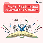 교육부, 국민교육발전을 위해 헌신한 교육유공자 43명 선정 및 전수식 개최 - 유치원, 어린이집 학부모 및 가정양육자 대상, 시험조사 결과를 토대로 2018년 본조사 여부 결정 - 교육부(부총리 겸 교육부장관 김상곤)는 8월 28일(월) 교육시설재난공제회에서「국민교육발전 유공자 훈․포장 전수식」을 개최하였습니다. 이번 전수식에서는 교육 전 분야에 걸쳐 투철한 교육관과 사명감을 가지고 헌신해 사회의 귀감이 된 12명을 국민교육발전 유공자로 선정하고, 훈․포장을 수여하였습니다. 〈국민교육발전 유공 훈․포장 수상자 현황〉 또한, 국민교육발전 유공자로 함께 선정이 된 대통령 표창 15명과 국무총리 표창 16명은 각 추천 기관장이 전수할 예정입니다. 국민교육발전 유공자 포상은 국민교육헌장 선포(1968.12월)를..