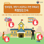 정부합동, 개학기 초등학교 주변 위해요인 특별점검․단속 - 교통‧식품‧위해업소‧불법광고물 등 4개분야 점검으로 안전한 학교환경 조성 - 행정안전부(장관 김부겸)는 개학기를 맞아 어린이 안전사고 예방을 위하여 정부 합동으로 전국 초등학교 주변 위해 요인에 대하여 안전점검 및 단속을 실시한다고 밝혔습니다. 이번 점검은 8월 28일부터 9월 22일까지 4주간에 걸쳐 전국 초등학교 6,000여 개를 대상으로 실시하며, 행정안전부, 교육부, 여성가족부, 식품의약품안전처, 경찰청 등 5개 중앙 부처와 소속기관, 자치단체 등 717개 기관이 참여합니다. 특히, 어린이 교통사고 발생의 주요 요인이 되는 불법주정차 및 학교 주변 문구점, 분식점 등 어린이 기호식품 조리‧판매업소의 위생관리 등에 대하여 집중적으로 살펴볼 ..