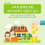 교육부․통계청 공동, 유아사교육비 시험조사 실시 - 유치원, 어린이집 학부모 및 가정양육자 대상, 시험조사 결과를 토대로 2018년 본조사 여부 결정 - 교육부(부총리 겸 교육부장관 김상곤)와 통계청(청장 황수경)은 초․중․고사교육비에 이어 학부모의 부담이 커지고 있는 유아사교육비의 실태를 파악하고, 관련 정책수립 및 연구의 기초로 활용하기 위하여 금년에 처음으로 유아사교육비 시험조사*를 실시합니다. * 본조사에 앞서 실시하는 예비조사로 조사문항 등의 적합성을 살펴보기 위함 이번 시험조사는 누리과정을 적용받는 유아(유치원, 어린이집의 만3~5세아) 및 가정양육자 중 대전광역시와 전라북도 지역에 거주하는 학부모 약 2,100명*을 대상으로 하며, 지난 3개월(2017.6~8월) 간의 사교육 경험 및 지출비..