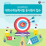 2018학년도 대학수학능력시험 응시원서 접수 - 금년부터 수능 응시수수료 면제 대상을 법정차상위계층까지 확대 교육부(부총리 겸 교육부장관 김상곤) 및 한국교육과정평가원은 2017. 11. 16.(목)에 실시되는 2018학년도 대학수학능력시험 응시원서를 2017. 8. 24.(목)부터 전국 85개 시험지구교육청 및 일선 고등학교에서 일제히 접수한다고 발표하였습니다. 2018학년도 대학수학능력시험 응시원서는 2017. 8. 24.(목) ~ 9. 8.(금)까지 12일간(토요일 및 공휴일 제외) 접수하며, 접수 시간은 09:00~17:00까지입니다. 수험생은 응시원서를 접수한 후에라도 접수 기간 중에는 시험 영역 및 과목 등 접수 내역을 변경하거나 응시원서 접수를 취소할 수 있다. 응시원서는 본인이 직접 접수하..