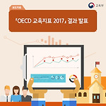 「OECD 교육지표 2017」 결과 발표 교육부는 경제협력개발기구(OECD)에서 2017년 9월 12일 11:00(프랑스 기준)에 공개하는 「OECD 교육지표 2017」의 주요 지표를 분석․발표했습니다! 매년 발표되는 「OECD 교육지표」는 회원국들이 교육 기회를 확대하고 교육의 사회적 성과를 제고하는데 필요한 국제 비교자료를 제공하고 있어, 교육정책 수립의 기초자료로 활용되고 있는데요. OECD 교육지표 중 우리나라에서 관심이 있는 지표를 발췌하여 분석한 내용을 살펴볼까요? 1. 학습 환경 및 학교 조직 ◆ 교사 1인당 학생 수 : 초 16.8명, 중 15.7명, 고 14.1명 ◆ 학급당 학생 수 : 초 23.4명, 중 30.0명 교사 1인당 학생 수(2015년)는 초등학교 16.8명, 중학교 15..