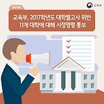 교육부, 2017학년도 대학별고사 위반 11개 대학에 대해 시정명령 통보 교육부(부총리 겸 교육부장관 김상곤)는 지난 9월 13일 교육과정정상화 심의위원회(이하 “위원회”)를 개최하고, 2017학년도 대학별고사를 실시한 대학 중 고등학교 교육과정을 벗어난 내용을 출제하거나 평가함으로써 공교육정상화법*을 위반한 대학을 최종 확정하여 통보하였습니다! * 「공교육 정상화 촉진 및 선행교육 규제에 관한 특별법」 2017학년도 논술 및 구술․면접고사를 시행한 57개 대학의 2,294개 문항을 대상으로 한국교육과정평가원의 선행교육예방연구센터*에서 고등학교 교육과정 위배 여부를 분석하였으며, 위원회의 심의를 거쳐 위반대학을 결정하였는데요. * 근거: 공교육정상화법 시행령 제2조(선행교육예방연구센터의 운영)에 따라 선..