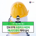 안전은 어릴 때부터 체험해야 - 전국 17개 초등학교 어린이 재난안전훈련 확대 실시 - 교육부(부총리 겸 교육부장관 김상곤)와 행정안전부(장관 김부겸)는 다가오는 2017. 10. 30.부터 11. 3.까지 전국적으로 실시되는 ’2017 재난대응 안전한국훈련‘의 일환으로 ’어린이 재난안전훈련‘을 17개 초등학교를 대상으로 실시할 예정입니다! 어린이 재난안전훈련은 작년 2개 초등학교를 대상으로 시범적으로 운영한 결과, 어린이들이 스스로 참여하고 체험하면서 재난대응요령을 습득하는 과정에서 안전훈련에 관한 학교구성원들의 선호도와 참여도가 높아지게 되었는데요. 이에 따라 금년에는 각 시ㆍ도별 1개 초등학교를 선정하여 어린이 재난안전훈련을 확대 실시합니다! 어린이 재난안전훈련은 9월 25일부터 11월 3일까지 5..