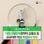 대형 식품업체로부터 상품권 등 수수여부 학교 특별조사 착수 - 시·도교육청별 조사결과에 따라 관련자 엄중조치 - 교육부(부총리 겸 교육부장관 김상곤)는 공정거래위원회 조사결과(2016.7.~2017.9.), 대형 4개 식품제조업체*가 학교급식 납품실적에 따라 학교 영양사 등 급식관계자에게 상품권 등을 제공**한 불공정행위 사실이 확인됨에 따라(붙임참조), 시·도교육청 관계관 긴급회의를 개최(2017.9.25.14:00)하여 특별조사를 실시한다고 밝혔습니다. * ㈜푸드머스와 10개 가맹사업자, CJ프레시웨이(주), 대상(주), (주)동원F&B ** 공정거래법(법 제23조제1항제3호)에서 금지하는 ‘부당한 이익에 의한 고객유인 행위’ 교육부는 이날 회의에서 이번 특별조사를 통해 학교 영양사 등 급식관계자가 ..