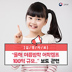 “올해 여름방학 어학캠프 100억 규모...”보도 관련 오늘 “올해 여름방학 어학캠프 100억 규모...1인당 350만원짜리도”라는 제목의 기사가 한국일보, 내일신문 등 매체를 통해 보도됐습니다. / 관련 보도 내용 해당 기사에 따르면, 학교시설을 이용한 여름방학 어학캠프가 급증하면서 올해 캠프에 지출된 비용이 약 100억 원에 달하며, 2014년 이전 맺어진 지자체와 학교간 어학캠프 협약은 15건 뿐, 2014년과 2015년, 2016년 9건에 이어 올해 41건이 새로 체결됐다고 보도했습니다. / 설명 내용 이에 대한 교육부의 설명은 다음과 같습니다. 2017년 여름방학 기간에 대학 등 학교시설을 이용한 어학캠프는 총 77건으로, 저소득층 및 농어촌 지역 학생 등의 글로벌 역량 및 실용 외국어 능력을 ..