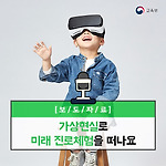 가상현실로 미래 진로체험을 떠나요 -최신 IT기술을 활용한 가상체험과 전문가 진로멘토링을 융합한 진로탐색 제공- 교육부가 2017.10.27.(금), 10:00~15:00에 제주제일중학교를 시작으로 전국 17개 중‧고교에서 「스마트 가상 진로체험」을 시범운영합니다! 「스마트 가상 진로체험」 사업은 4차 산업혁명을 촉발한 인공지능, 사물인터넷, 빅데이터 등 미래 신기술 관련 가상 진로체험을 통해 미래 진로설계 역량 강화를 지원하기 위해 마련되었는데요. 그럼 행사개요 먼저 살펴볼까요? (주요내용) 가상 진로체험 컨텐츠를 활용한 온라인 체험과 가정, 학교, 유관 연구소와 연계한 오프라인 체험의 융합적 경험 제공 (개발규모) VR기기 활용 가상 진로체험 콘텐츠 및 교안 각 2종 * (2종) 미래 지구에서의 생활..
