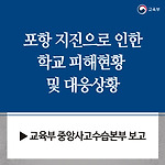 포항 지진으로 인한 학교 피해현황 및 대응상황 - 교육부 중앙사고수습본부 보고 - 교육부는 11월15일(수) 포항에서 발생한 지진에 대하여 학생 및 학교시설의 피해 현황 및 대응상황을 밝혔습니다. 그럼 먼저 2017년 11월 15일 22:00 기준 피해현황을 살펴보겠습니다. 포항 지진으로 인해 인명피해는 없으나 일부 학교 시설물에서 피해가 발생했습니다. 현재까지 경북ㆍ대구지역 등 학교 및 소속기관 총 60개(유·초·중등 58개교(경북 46, 대구 8, 대전, 2, 울산 2), 대학 1개교(한동대), 소속기관 1개(대구학생수련원))의 시설물에서 벽체 균열, 천정 마감재ㆍ타일 탈락 등의 피해발생이 시ㆍ도교육청으로부터 보고되었습니다. 학생 안전 및 추가 피해 예방을 위해 지진발생 이후 포항지역 187개교(유 ..