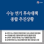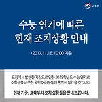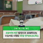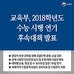 교육부, 2018학년도 수능 시행 연기 후속대책 발표 - 문답지 보안 강화를 위해 경찰인력 증원, 순찰 강화 - - 전체 시험장 안전점검 실시 및 포항 대체 시험장 확보 - - 대학별 논술, 면접 등 수․정시모집 일정 1주일 연기 - - 피해지역 수험생 학사관리․심리치료 및 수험준비 지원 - 교육부는 2018학년 수능 시행 연기에 따른 후속대책을 발표하였습니다. 교육부는 경북 포항에서 5.4 규모의 지진이 발생한 즉시 수능시험 비상대책본부장을 부총리로 격상하여 대책회의를 실시한 결과, 2018학년도 수능을 1주일 연기한 11월 23일(목)에 시행하기로 어제 결정한 바 있는데요. 교육부는 연기 결정 이후 국무총리 주재 긴급 관계장관회의와 교육부 수능시험비상대책본부 대책회의를 실시하여 2018학년도 수능 시..