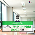 교육부, 서남대학교 폐쇄명령 행정예고 시행 - 20일 간 행정예고 후, 청문을 거쳐 12월 중 폐쇄명령 - 교육부는 11월 17일(금)에 고등교육법 제62조에 따라 서남대학교에 대한 학교폐쇄 방침을 확정하고, 이에 따른 후속 절차로 20일 간 행정예고를 진행한다고 밝혔습니다. 또한, 학교법인 서남학원에 대해서는 서남대 외에 더 이상 운영하는 학교가 없어 법인 해산명령도 함께 행정예고 합니다. 서남대는 2012년 사안감사(설립자 이홍하의 교비 330억 횡령 및 전임교원 허위 임용 등 불법사례 13건 적발), 2017년 특별조사 결과(교직원 급여 156억 체불 및 전임교원 책임강의시간 미준수 등 부당사례 31건 적발)에서 설립자 이홍하의 교비 333억 원 횡령과 교직원 급여 156억 원 체불(2017.2. ..