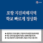 포항 지진피해지역 학교 빠르게 정상화 - 휴업학교 23교로 줄어, 27일부터 학사운영 정상화 예정 - - 학교․교육시설 응급복구 완료, 전체복구율 94.9% - - 수능시험 연기 고충처리센터, 4일간 276건 고충 처리 - 교육부는 11월 21일(화), 지진피해를 입은 포항지역의 학교피해 응급 복구 및 휴업 현황, 수능시험 연기 고충처리센터 운영 상황에 대하여 발표하였습니다. 휴업 등 학사운영 정상화 현황 포항지역은 지진으로 인한 휴업 학교 수는 23개교(휴업률 9.5%, 전일대비 △6교, 2017.11.20. 20:00기준)이며, 27일 부터 장성초 1개교(장성초(병설유치원 포함)는 학부모대표와 분산교육․조기방학 등 조치계획 협의 중)를 제외한 모든 학교의 학사 일정이 정상화될 예정입니다. 안전진단 결..