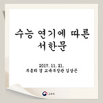 수능 연기에 따른 서한문 전국의 수험생과 학부모님, 그리고 존경하는 교육가족 여러분! 2018학년도 수능이 며칠 앞으로 다가왔습니다. 그동안 지진 및 수능 연기로 인해 고생하셨을 전국의 수험생 및 학부모님, 그리고 교육가족 여러분께 마음 깊이 위로의 말씀을 드립니다. 이번 수능 연기 결정은 ‘학생의 안전은 그 무엇과도 바꿀 수 없다’는 마음으로 고심 끝에 내린 불가피한 선택이었음을 이해해 주시기 바랍니다. 교육부는 수능 시험 연기를 결정한 이후, 수험생 여러분들이 조금이라도 불편을 겪지 않도록 모든 관계 부처와 힘을 모아 만반의 준비를 갖추기 위해 최선의 노력을 다하고 있습니다. 하지만 연일 계속되는 여진으로 포항 지역 수험생과 학부모님, 그리고 전국의 교육가족 여러분들의 불안과 걱정이..