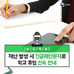 재난 발생 시 긴급재난문자로 학교 휴업 신속 안내 - 시·도교육청 긴급재난문자 활용 체계 구축 - 교육부는 12월 1일부터 호우ㆍ폭설ㆍ지진 등 재난으로 인해 시ㆍ도 교육청에서 긴급히 학교휴업을 결정하고 신속하게 학생 및 학부모에게 안내가 필요한 경우 긴급재난문자(CBS:Cell Broadcasting Service)를 활용한다고 밝혔습니다. CBS란 CBS 수신기능이 있는 휴대전화에 기지국을 통해 재난문자를 수신하는 위치기반 서비스를 말하는데요. 이는 최근 잦아지는 국지성 집중호우ㆍ지진 등 대규모 재난 발생 시 학생․학부모에게 학사운영 조정사항을 신속하게 전파할 필요성이 제기되어 행정안전부와 모든 광역지자체(2017.8.16.부터 긴급재난문자 송출 승인권한을 17개 광역지자체에 부여)의 긴밀한 협조로 이..