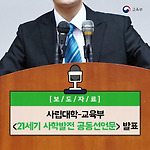 사립대학-교육부 발표 교육부와 한국사립대학총장협의회는 사립대학 입학금 폐지 합의 이후(11월 24일), 사립대학의 바람직한 발전 방향을 모색하는 자리(12.1.(금) 한국사립대학총장협의회 정기총회)를 마련하여 공동선언문을 함께 채택하였다고 밝혔습니다! 그럼, 선언문의 내용을 함께 살펴볼까요? 교육부와 사립대학은 4차 산업혁명 시대에 고등교육의 경쟁력을 확보하고, 대학의 자율성과 학문의 자유를 통해 세계적 수준의 고등교육을 육성하기 위하여 아래와 같이 공동으로 노력한다. 1. 사립대학은 헌법이 보장하는 학문의 자유를 누리며, 교육․연구․산학협력을 통해 고등교육기관으로서 공적 책무를 다하고 국가․사회 발전에 기여한다. 2. 국가 경쟁력의..