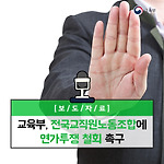 교육부, 전국교직원노동조합에 연가투쟁 철회 촉구 교육부는 2017.12.12.(화), 전국교직원노동조합(전교조)에 2017.12.15.(금), 예정된 연가투쟁을 철회할 것을 촉구한다고 밝혔습니다! 교육부는 국민의 여망을 담아가는 교육정책의 구현을 위하여 모든 교육 구성원이 꾸준한 대화와 이해 속에서 모두 함께 더 나은 교육 여건을 만들 필요가 있음을 강조하며, 공교육의 신뢰 확보와 정상적인 학교 운영을 위하여 전교조에 연가투쟁 철회를 요청한다고 밝혔습니다. 이 보도자료와 관련하여 보다 자세한 내용이나 취재를 원하시면 교육부 교원복지연수과 권지영 사무관(☎ 044-203-6464)에게 연락주시기 바랍니다. 아울러, 교육부는 학생들의 학습권 보호를 위하여 시․도교육청 및 각급 학교에 관계 법령에 따라 교원의..