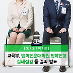 교육부, 법학전문대학원 입학전형 실태점검 등 결과 발표 - 블라인드 면접 실시 등 입시 투명성이 강화된 것으로 나타나 - 교육부는 「법학전문대학원(이하 법전원) 입학전형 및 취약계층 장학금 지급 실태점검」 결과를 12.13.(수)에 발표하였습니다! 이번 실태점검은 문재인 정부 국정과제인 “법학전문대학원 입학전형 공정성 강화”를 위해 추진하였으며, 교육부는 이번 점검을 시작으로 매년 8-9개 법전원에 대해 입학실태 점검을 하여 3년 주기로 모든 법전원에 입학실태 점검을 할 예정인데요. 이번 점검대상 법전원은 총 8개교*(국립 5개교: 경북대, 부산대, 전북대, 제주대, 충남대 / 사립 3개교: 동아대, 인하대, 한양대)로 2016년 입학전형 실태조사 시 문제가 지적된 대학 및 점검희망대학 등을 우선 선정하..