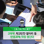 교육부, 학교안전·일자리 등 민생과제 직접 챙긴다 - 안전한 학교 환경을 위해 석면제거 및 안전대진단 현장 점검 나서 - 교육부는 학교안전, 일자리창출, 교육비 부담경감 등 국민의 삶과 밀접한 민생 관련 교육정책을 집중적으로 추진하기 위해 교육민생 일자리 추진단을 구성하고 현장 점검을 실시합니다. 우선, 2월 5일부터 시작된 교육시설 국가안전대진단 현장 점검을 위해 2월 9일 부총리를 비롯한 시도교육청 관계자들이 함께 경기 동수원초등학교*를 방문하여, 건강하고 쾌적한 학교환경 조성을 위한 학교 석면 제거 현장 등을 직접 확인합니다. * 2018년 겨울방학 중 3,643m2 석면제거 공사 수행(공사 후 합동점검 결과 석면 미검출) 이날 현장을 둘러보며 학교의 소방시설, 석면제거 등 학생 건강 및 안전 위협..