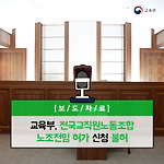 교육부, 전국교직원노동조합 노조전임 허가 신청 불허 교육부는 2. 12(월), 지난 2. 1(목) 전국교직원노동조합(이하 ‘전교조’)가 신청한 노조전임자 허가 요청(총 33명*)에 대하여 불허한다고 밝혔습니다. * 16개 교육청 27명 및 본부 6명 현재 전교조는 법적 지위와 관련한 소송이 대법원에 계류 중으로, 그 재판 결과를 지켜볼 필요가 있다고 판단되었고, 이로 인해 노조 전임허가를 불허한다고 밝혔습니다. 아울러, 교육부는 전교조와 지속적인 대화와 이해 속에서 교육 발전을 위한 동반자적 파트너쉽을 위하여 노력해 나갈 예정이라고 하면서 전교조에 많은 협력을 요청한다고 밝혔습니다.
