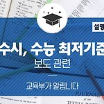 수시 ‘수능 최저기준’ 없어질까…교육부, 대학에 폐지 권고 보도에 관련하여 안내드립니다. 보도 내용은 다음과 같습니다. ○교육부는 최근 각 대학에 보낸 ‘고교교육 기여대학 지원사업’ 세부사항 안내문에서 수능 최저학력 기준 폐지를 권고 ○2019학년도 수시모집에서 대학수학능력시험 최저학력 기준을 없애거나 완화하는 대학이 더 늘어날 전망 ‘고교교육 기여대학 지원사업’을 통한 수능 최저학력기준과 관련된 이번 권고사항을 대학이 수용하여 수능 최저학력기준을 축소・폐지할 경우 이는 2020학년도 대입전형부터 적용되는 사항입니다. 2019학년도 대입전형 상 수능 최저학력기준은 2017년 4월에 공표된 대학별 대학입학전형시행계획에 따라 적용됨을 알려드립니다.