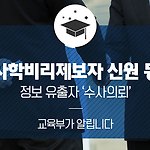 정보 유출 및 「청탁금지법」위반 의혹의 조사 결과를 발표했습니다. 교육부(부총리 겸 교육부장관 김상곤)는 5월 4일 사학비리제보자 신원 등 정보 유출 의혹에 대한 조사 결과, 5월 4일 자로 교육부 서기관 1명을 직위해제 및 ‘중징계’ 의결 요구하고, 사립대 교직원 2명과 함께 수사의뢰하는 등 엄정 조치하였다고 밝혔습니다. 조사 결과는 다음과 같습니다. ① 최근 언론에 보도된 경기 소재 A대학 내부비리제보자 인적사항 유출 의혹과 관련하여, 위 서기관 ㉠은 교육부에 접수된 A대학 내부비리 신고내용을 이미 알고 있는 상황에서 대학 선배인 B대학(A대학과 같은 학교법인 소속) 직원 ㉡과 수회 만났고 A대학 실태조사 결과 발표 이틀 후 저녁식사를 함께 하면서 위 발표된 결과 관련 사항에 대하여 대화한 사실을 확..
