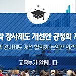 ‘대학 강사제도 개선 협의회’ 논의안 의견을 수렴합니다. 교육부(부총리 겸 교육부장관 김상곤)는 ‘대학 강사제도 개선 협의회(위원장 이용우, 이하 협의회)’ 주관으로 7. 13.(금) 14시에 서울교육대학교 종합문화관에서 대학 강사제도 개선(안)에 대한 공청회가 개최된다고 밝혔습니다. 이번 개선안은 「고등교육법 일부개정법률(강사법)」 시행 유예에 따라, 대학·강사대표 및 전문가(국회 추천) 12명으로 구성된 협의회에서 집중워크숍 2회를 포함하여 총 15차례 논의를 거쳐 마련된 것으로, 그간의 협의회 논의 내용을 이번 공청회를 통해 발표하고 대학과 강사 등 현장의 의견을 청취하고 수렴합니다. 협의회는 공청회 이후, 발표된 개선안을 보완하여 국회 및 교육부 등 정부에 건의할 예정입니다.