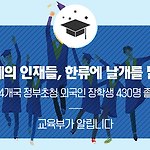 104개국 정부초청 외국인 장학생 30명 졸업 교육부(부총리 겸 교육부장관 김상곤)와 국립국제교육원(원장 송기동)은 8월 말 전국 57개 대학에서 정부초청 외국인 장학생 430명이 졸업(학부 30명, 석사 352명, 박사 48명) 한다고 밝혔습니다. 이번 졸업자는 총 104개국의 다양한 국적 출신으로, 권역별로는 아시아(218명, 51%), 유럽(66명, 15%), 아프리카(83명, 19%), 아메리카(63명, 15%) 순이며, 전공계열별로는 인문사회계열(242명, 53%), 자연공학계열(163명, 41%), 예체능계열(25명, 6%) 순입니다. 교육부와 국립국제교육원은 자국으로 돌아가는 301명의 학생들이(129명 국내 체류 예정) 한국에서의 경험과 지식을 펼칠 수 있도록 독려하고자 2018. 8. 1..