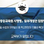「초․중등교육법 시행령」 일부개정안을 입법예고합니다. 교육부(부총리 겸 교육부장관 유은혜)는「초․중등교육법 시행령」일부개정안을 1월 7일(월)에 입법예고합니다. 이번 개정은 2012년부터 시행된 주5일 수업제의 현장 안착* 및 근로시간 단축제(주52시간)** 시행 등 학교 내․외의 변화에 대응하고, 맞벌이 부부의 학교행사 참여 등을 위한 토요일․공휴일의 교내․외 행사(체육대회, 수학여행 등)를 수업일로 인정하여 학교현장의 자율성을 확대하는데 목적이 있습니다. * 9개교(월 2회 토요휴무 실시)를 제외한 나머지 모든 학교는 주5일 수업제 전면실시(2018.10. 현재) ** 일과 삶의 균형(근로시간의 유연성 및 근로자의 건강권 보호) 개정안의 주요내용은 다음과 같습니다. 지금까지 초․중․고․고등기술학교 및..