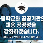 교육부(부총리 겸 교육부장관 유은혜)는 3월 12일(화) 「교육신뢰회복 추진단*(이하 추진단)」 4차 회의를 개최하였습니다. 회의 결과, 사립 초·중등 교원 신규채용 표준매뉴얼과, 공공기관 채용비리 근절대책을 마련하였습니다. * 부총리(단장) 주재로 교육신뢰회복 전반에 관한 과제를 상시 논의하는 회의 ■ 이제는 사립학교의 채용 과정도 공정하고 투명하게 진행됩니다. ▶ 사립 초·중등 교원 신규채용 표준 매뉴얼 제작 새로운 신규채용 매뉴얼에서는, ① 교육부, 시도교육청, 시도교육감협의회 및 사립학교법인협의회가 공동 제작하여 현장 실효성을 높이고, ② 채용 관련 법령의 조항들을 한눈에 확인할 수 있도록 구성하여 채용 공정성을 제고하였으며, ③ 사립학교 법인이 반드시 관할 교육청과 사전협의하여 신규채용 계획을 ..