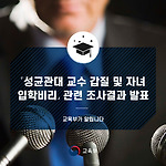 ⌜성균관대 교수 갑질 및 자녀 입학비리⌟ 관련 조사결과 발표 교육부(부총리 겸 교육부장관 유은혜)는 성균관대 교수 갑질 및 자녀 입학비리 관련 특별조사 결과를 3월 25일(월) 발표했습니다. 이번 조사는 성균관대 A교수가 자녀입시 준비를 위한 자녀의 연구과제 수행, 결과 작성 관련 사실관계 확인과 관련 실적의 입시자료 활용 여부 등을 확인하여 그에 상응한 조치를 취하기 위함이었습니다. ■ 조사결과는 다음과 같습니다. ① A교수는 자녀(B학생)의 연구과제 수행을 위해 연구실 대학원생들에게 동물실험을 지시했고,② B학생의 직접 참여 없이 대학원생들의 결과물로 B학생은 각종 연구과제상 등을 수상하였습니다.③ A교수는 B학생의 봉사활동을 대학원생에게 대신하도록 하여 봉사시간을 인정받았고,④ 사례금 명목으로 50..
