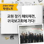 교원 장기 해외파견,귀국보고회에 가다! ▲ 분당 국립국제교육원(출처: 직접촬영) 지난 12월 17일, 분당 국립국제교육원은 설렘과 희망으로 가득찼습니다. 이 날은 바로 지난 1년 여동안 스와질랜드로 장기 해외파견을 다녀오신 교원분들의 귀국보고회가 있는 날이었는데요. 장기 해외파견이라는 말이 아마 많은 분들에게 생소한 단어가 아닐까 싶어요. 그리하여 이번 기사를 통해 국립국제교육원에서 주최하는 교원 해외진출사업을 소개해드리려고 합니다. 기사에는 이 날 아프리카 스와질랜드에 다녀 온 뒤 귀국 보고회에 참여하신 교원 분들의 생생한 목소리들도 담겨있으니 모두 주목해주세요. ▲ 교원 해외 진출 프로그램(자료출처: 국립국제교육원 제공 팜플릿) 교원 해외 진출 프로그램은 국립국제교육원에서 시행하는 사업으로 교원 장기..